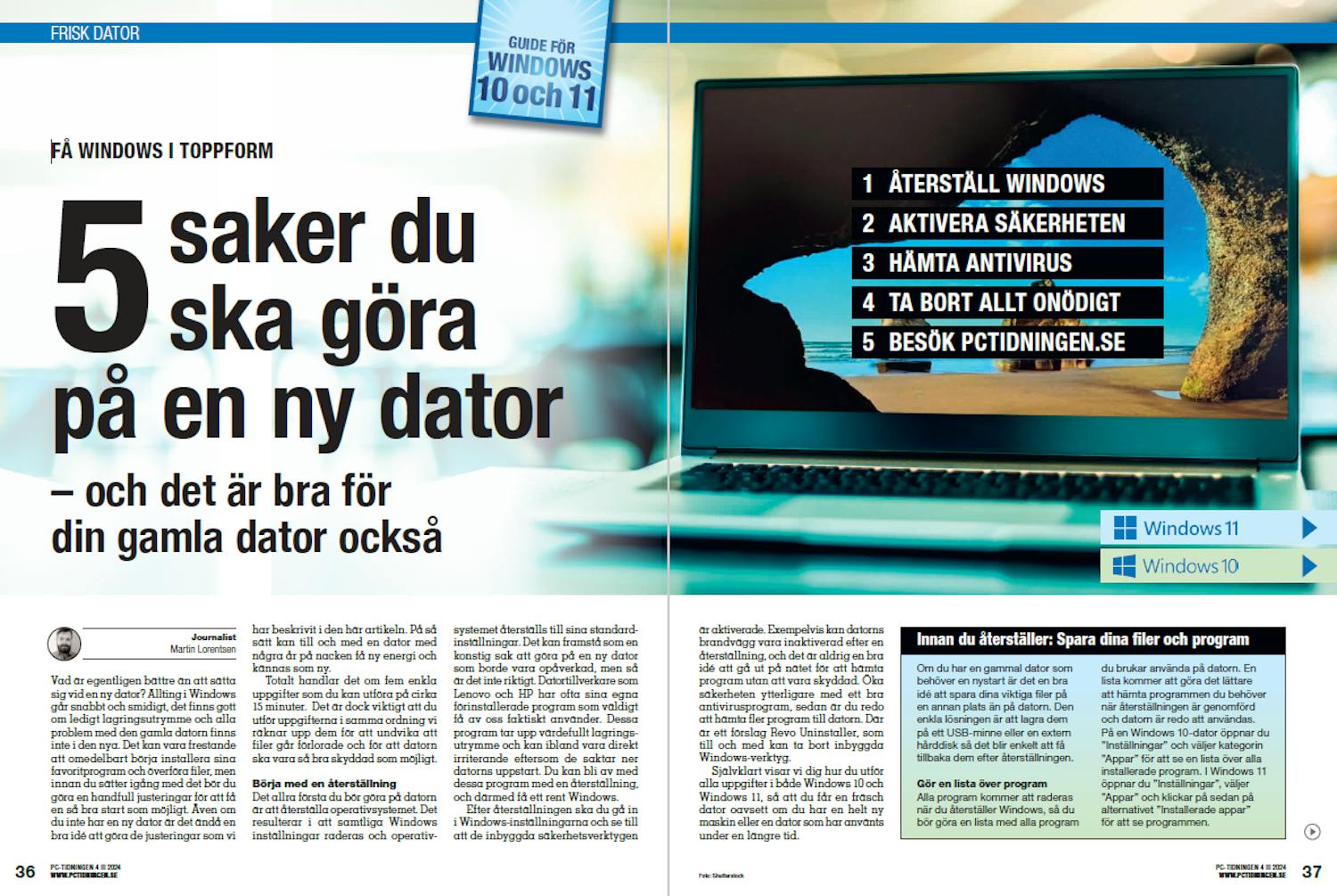 Även om du inte har en ny dator är det ändå en bra idé att göra de justeringar som vi har beskrivit i den här artikeln. På så sätt kan till och med en dator med några år på nacken få ny energi och kännas som ny. Totalt handlar det om fem enkla uppgifter som du kan utföra på cirka 15 minuter. Det är dock viktigt att du utför uppgifterna i samma ordning vi räknar upp dem för att undvika att filer går förlorade och för att datorn ska vara så bra skyddad som möjligt.