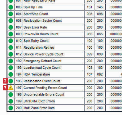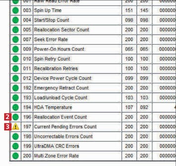 HDDScan har skapat ett SMARTtest av datorn. Gröna cirklar 2 visar att allt är bra. Utropstecken 3 visar att något är fel och behöver undersökas. Stäng fönstret.