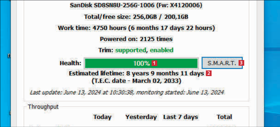 Först hämtar du SSD Life Pro från vår webbplats och installerar det. Kör programmet så får du en överblick över SSD:ns hälsa. Om Health visar 100% 1 är allt som det ska. Estimated lifetime 2 visar hur lång tid enheten förväntas leva baserat på nuvarande användning. Klicka du på S.M.A.R.T. 3 ser du en detaljerad SMART-analys av SSD:n.