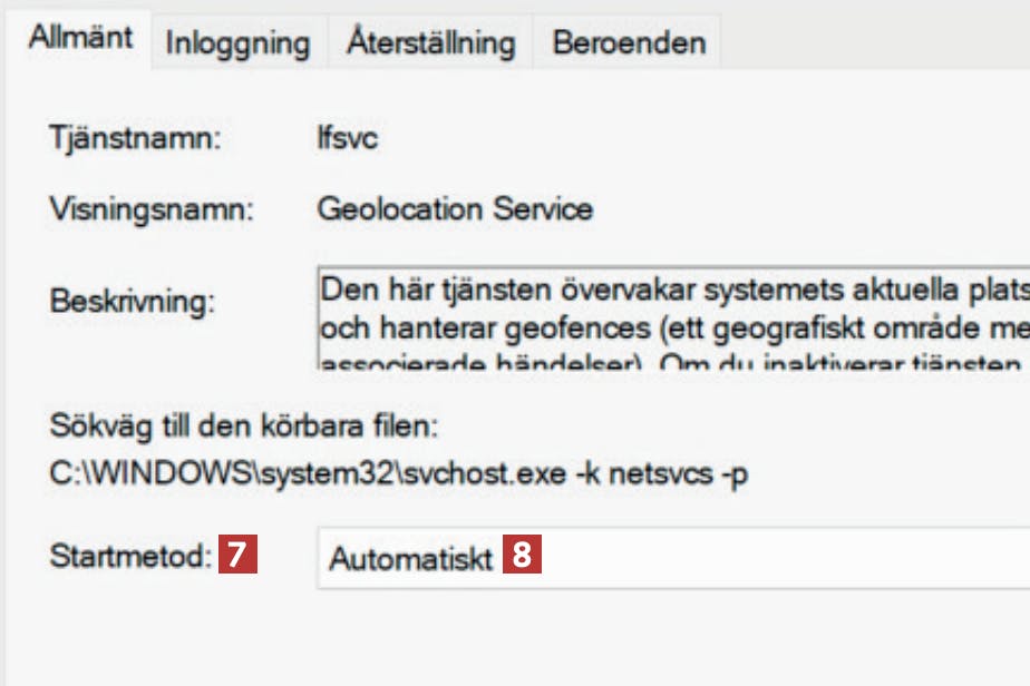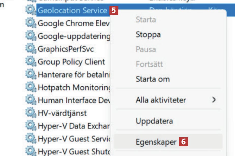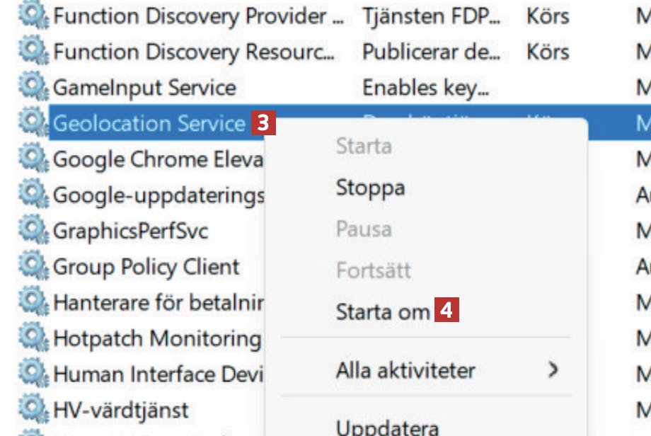 Leta reda på tjänsten Geolocation Service 3 och högerklicka på den. Välj alternativet Starta om 4.