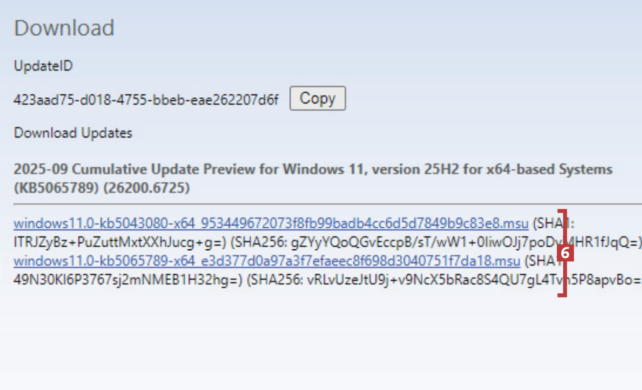 Besök uppdateringskatalogen via pctidningen.se/update. Sök efter uppdateringen (här KB5065789 1). Klicka på Search 2.