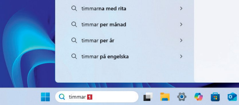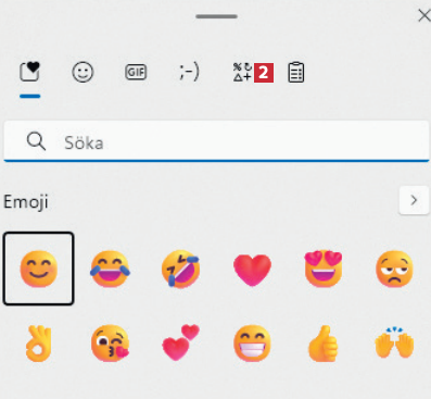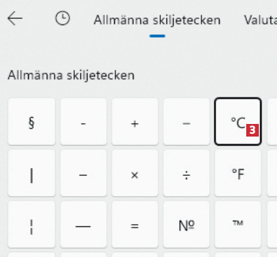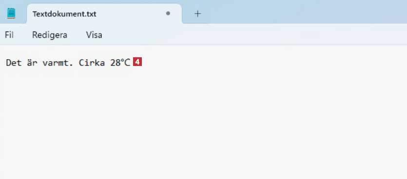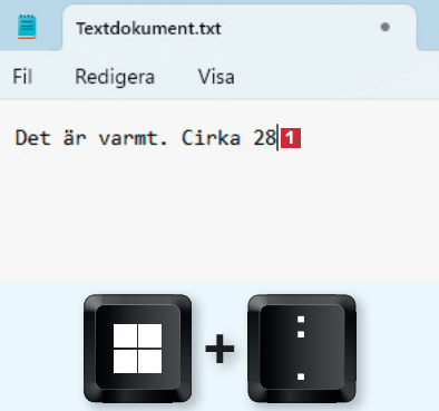 Här saknar vi ett tecken. Sätt markören 1 där du vill infoga tecknet, och använd sedan kortkommandot Windows-tangenten och punkt.