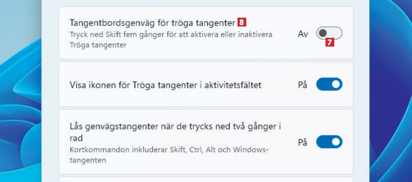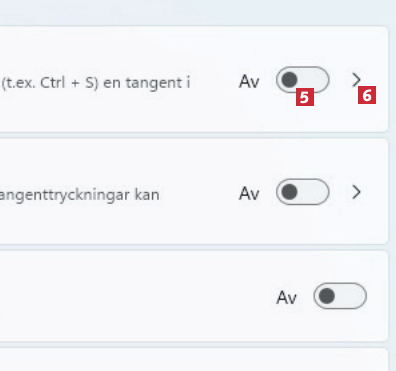 Stäng av reglaget vid Tröga tangenter 5. Klicka sedan på pilen 6. I Windows 10 finns det ingen pil och du går direkt till steg 6.