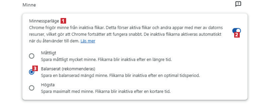 Gå till Chromes inställningar genom att skriva chrome://settings/performance i adressfältet och tryck på Retur. Gå till sektionen Minnessparläge 1 och aktivera funktionen 2. Välj sedan Balanserat 3.