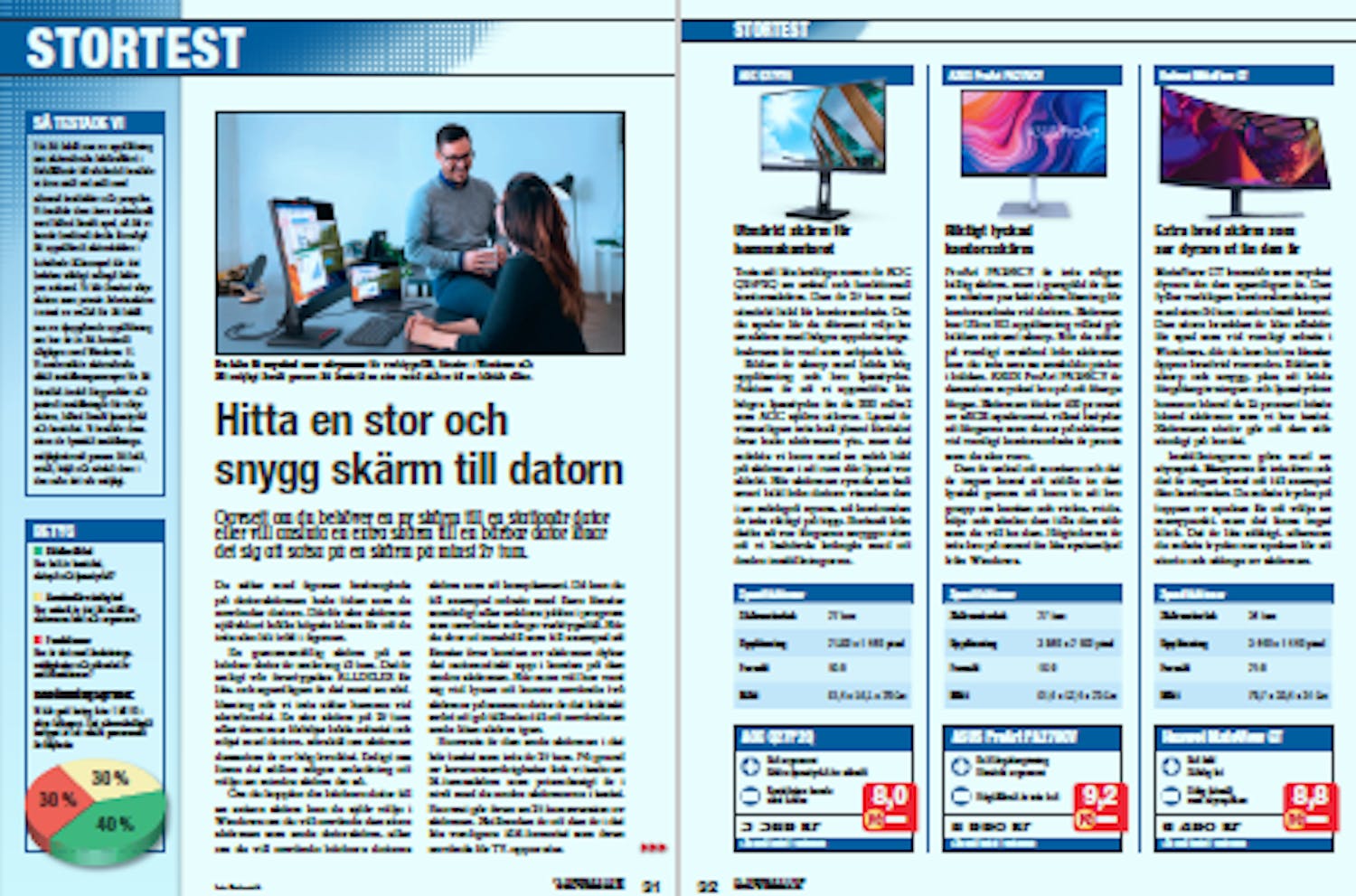 Huaweis är den enda skärmen i det här testet som inte är 27 tum. På grund av leveranssvårigheter fick vi testa en 34-tumsskärm som prismässigt är i nivå med de andra skärmarna i testet. Huawei gör även en 27-tumsversion av skärmen. Skillnaden är att den är i det lite vanligare 16:9-formatet som även används för TV-apparater.