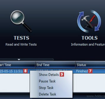När det till slut står Finished 7 är programmet färdigt. Högerklicka på det genomförda testet 8 och välj Show Details 9.