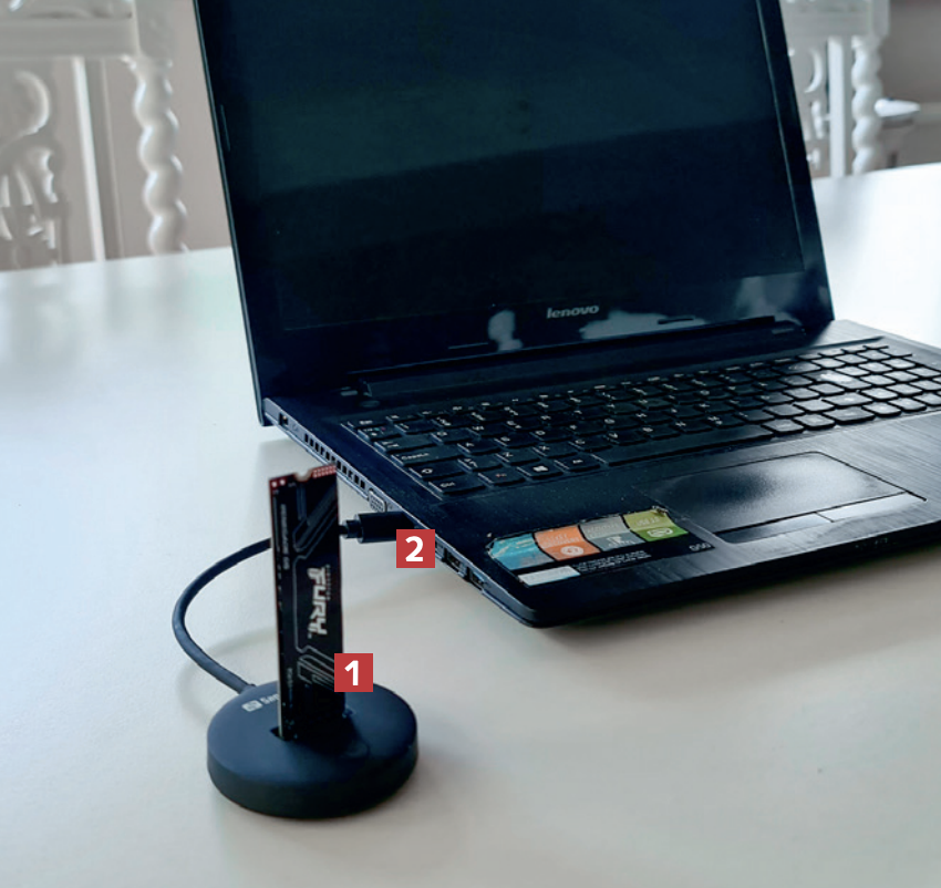 Anslut den nya NVMe- eller SATA-enheten i dockningsstationen 1 , som du sedan ansluter till datorn 2.