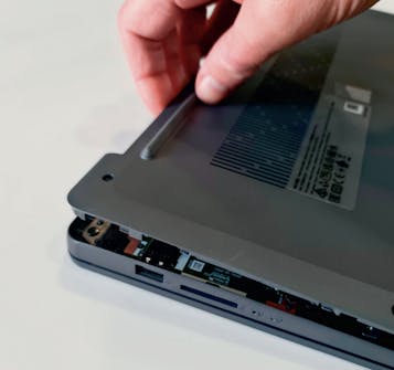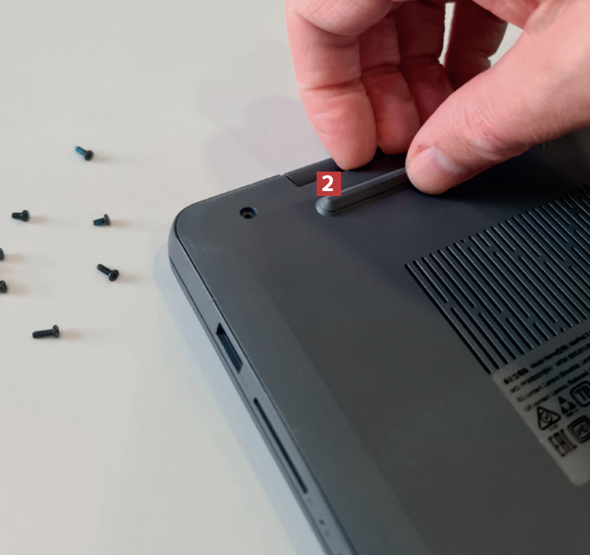Koppla bort strömmen till datorn och vänd den med undersidan uppåt. Ta bort skruvarna 1 som håller fast bottenplattan. I vissa fall behöver du bara ta bort en liten lucka.