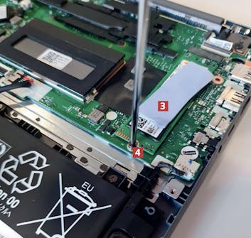 Leta reda på den befintliga NVMe-enheten som sitter på moderkortet 3. Ta sedan bort den lilla skruven 4 som håller den på plats.