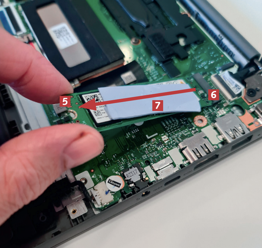 Lyft den försiktigt 5 och dra ut den från sockeln 6. NVMeenheter har ofta en liten kudde 7 som du kan behöva till den nya enheten.