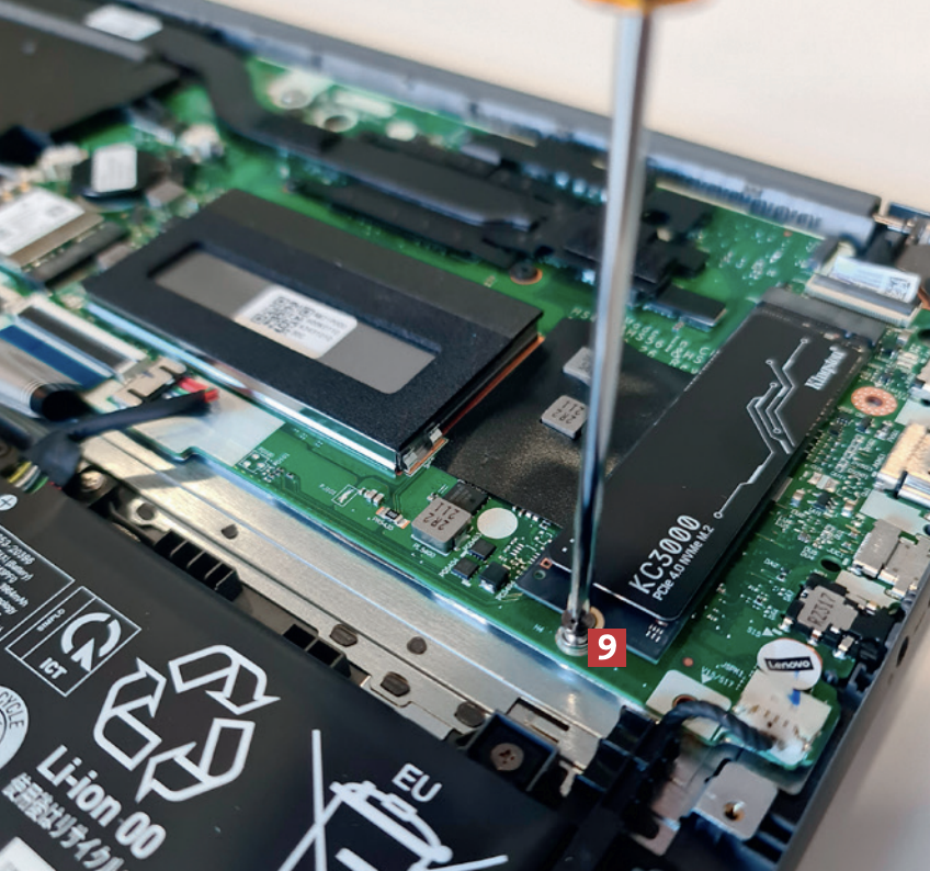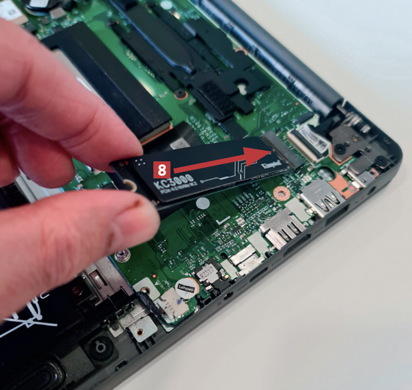 Pressa försiktigt in den nya NVMe-enheten i sockeln 8 och tryck den nedåt på plats. Tryck dit den självhäftande kudden som du tog bort från den gamla enheten.