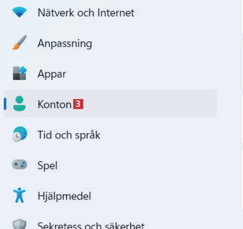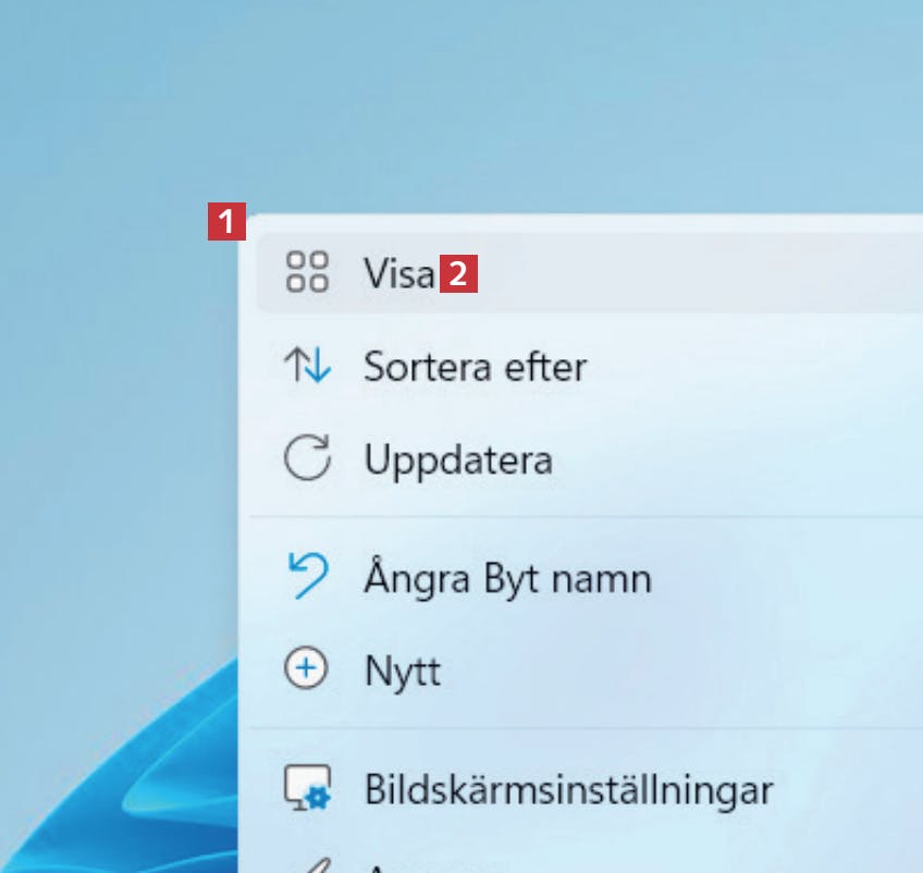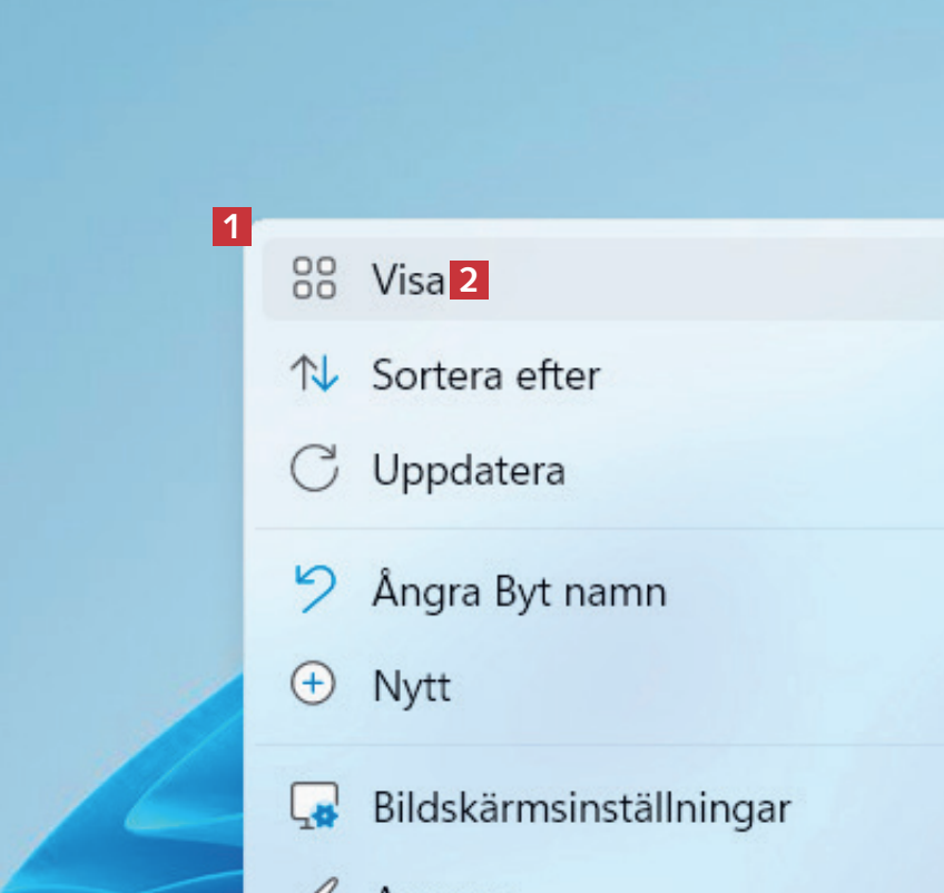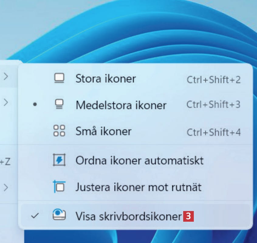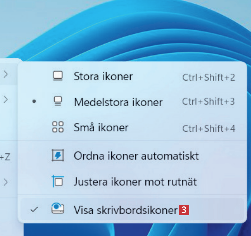 Välj underkategorin Visa skrivbordsikoner 3 så att papperskorgen och andra ikoner syns på skrivbordet.