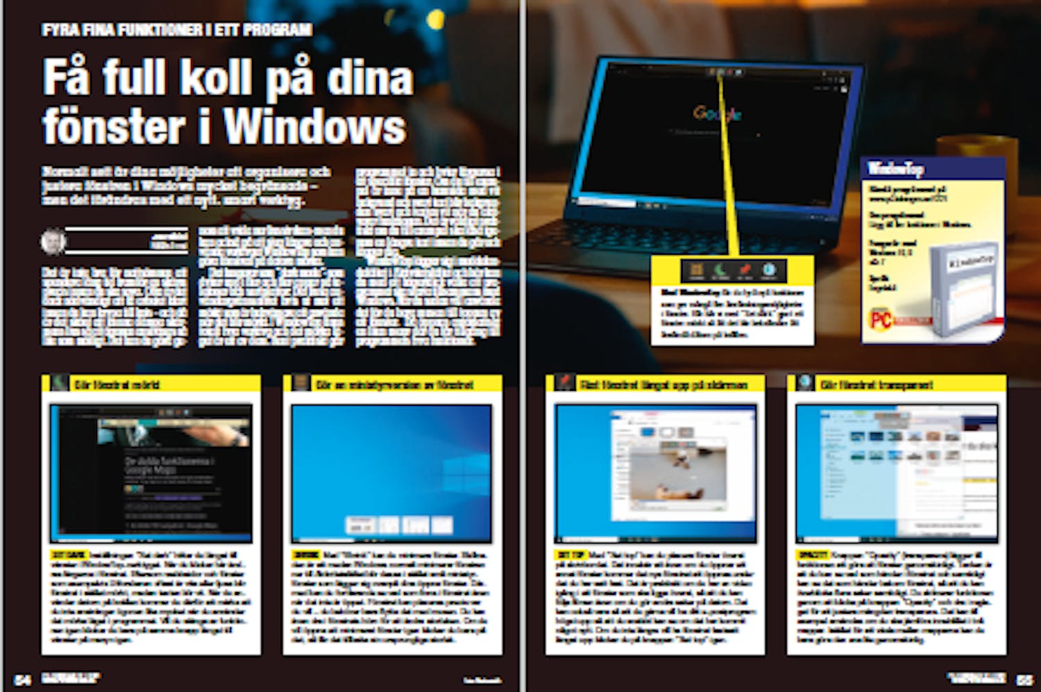 Det är väldigt praktiskt om du till exempel måste läsa igenom en längre text innan du går och lägger dig. WindowTop lägger sig i meddelandefältet i Aktivitetsfältet och här kan du med ett högerklick välja att programmet ska starta tillsammans med Windows. När du sedan vill använda det för du bara musen till toppen av ett fönster. Då öppnas automatiskt en liten meny där du får tillgång till programmets fyra funktioner.