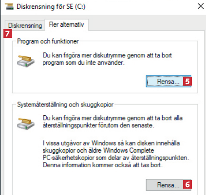Rensa bland program och funktioner med Rensa... 5 och ta bort gamla återställningspunkter med Rensa... 6. Klicka på fliken Diskrensning 7.