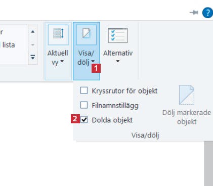 Öppna Utforskaren och välj Visa följt av Visa/dölj 1 (i Windows 11 klickar du på Visa och Visa igen). Markera Dolda objekt 2.