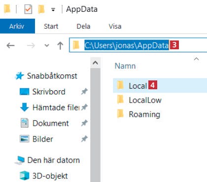 Navigera till systemmappen C:\Users\jonas\AppData 3 (byt ut jonas med ditt användarnamn). Klicka sedan på Local 4.