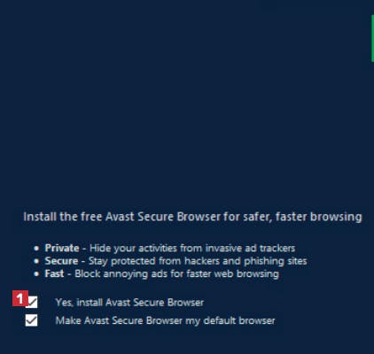 Hämta Avast Free Antivirus från vår hemsida. Starta installationen och ta bort markeringen vid Yes, install Avast Secure Browser 1 innan du klickar på Install.