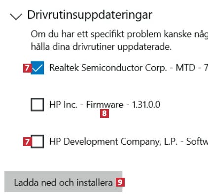 Markera de drivrutiner du vill uppdatera 7. Undvik att välja BIOS eller firmware 8, eftersom det kan orsaka tekniska problem. Klicka på Ladda ned och installera 9.