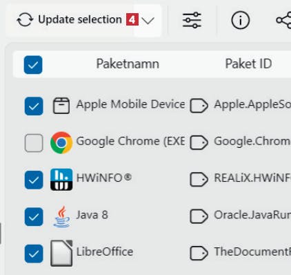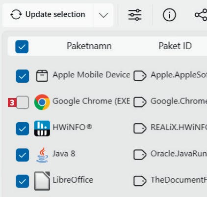En lista med uppdateringar visas. Om du vill behålla en äldre version av ett program tar du bara bort markeringen 3 vid det programmet