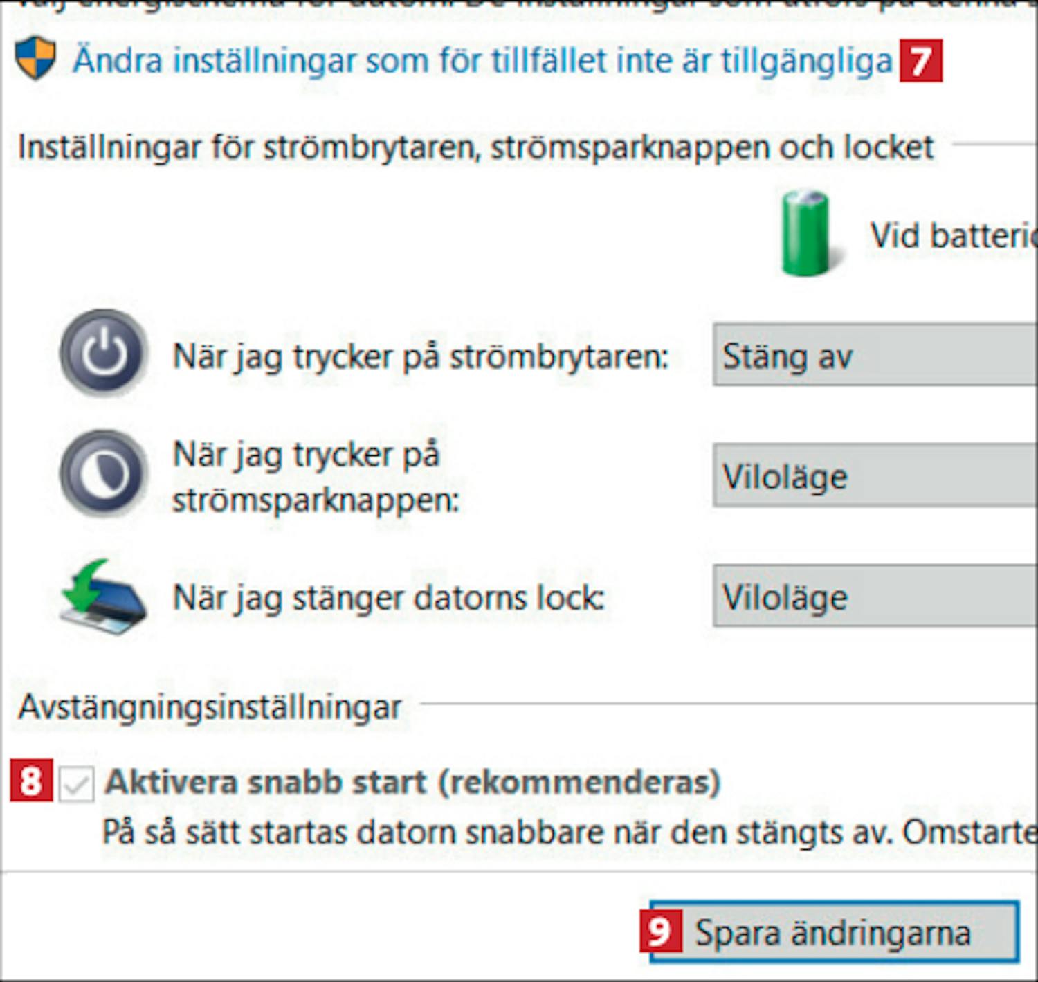 Klicka på Ändra inställningar som för tillfället inte är tillgängliga 7 och ta bort markeringen vid Aktivera snabb start 8 . Klicka sedan på Spara ändringarna 9 .