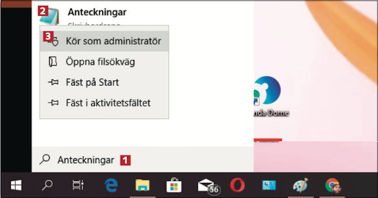 Sök efter anteckningar 1, högerklicka på Anteckningar 2 och välj Kör som administratör 3.