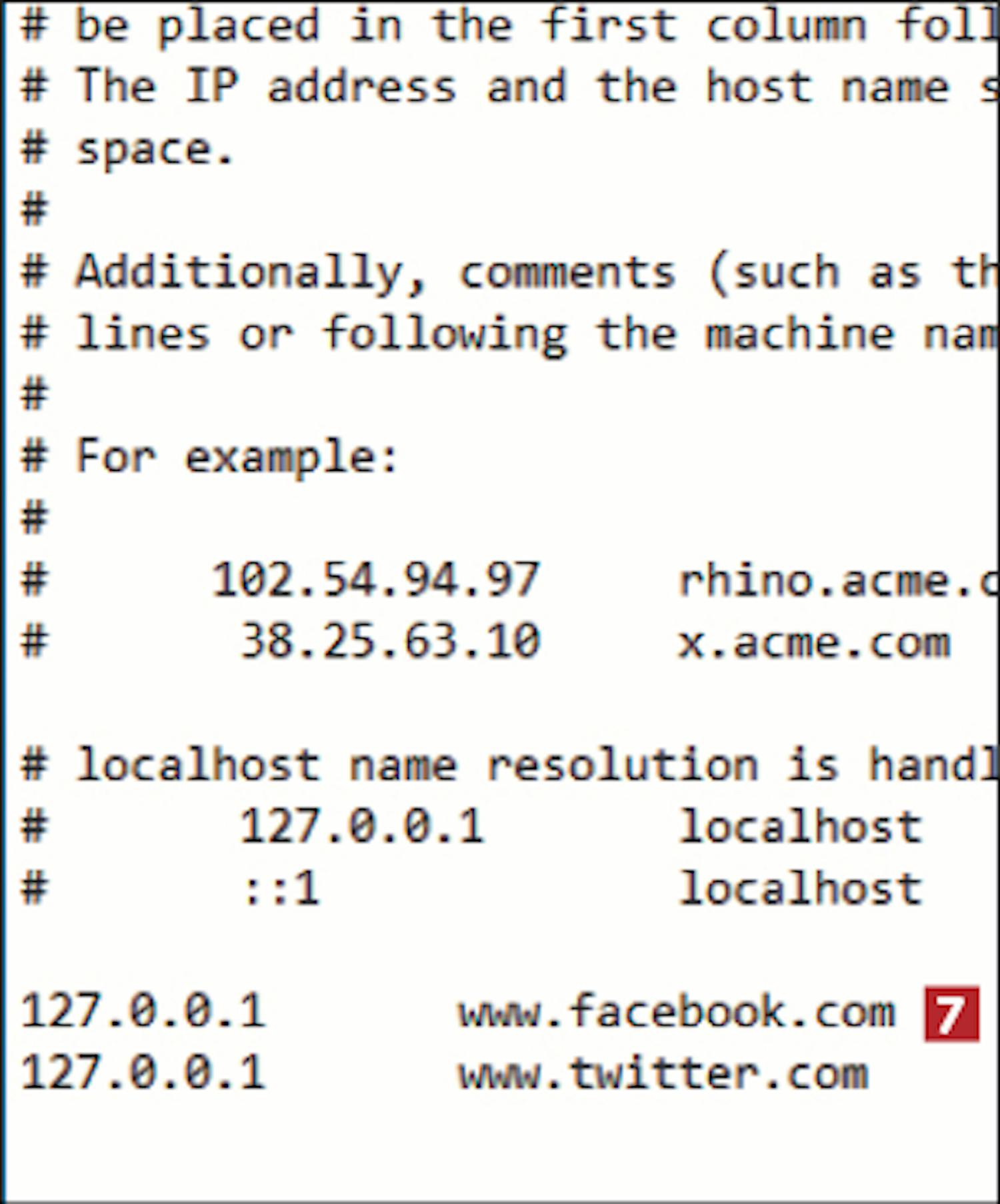 Längst ner i filen skriver du in: 127.0.0.1 www.facebook.com 7 (och eventuella andra webbadresser). Tryck på Ctrl+S för att spara filen.