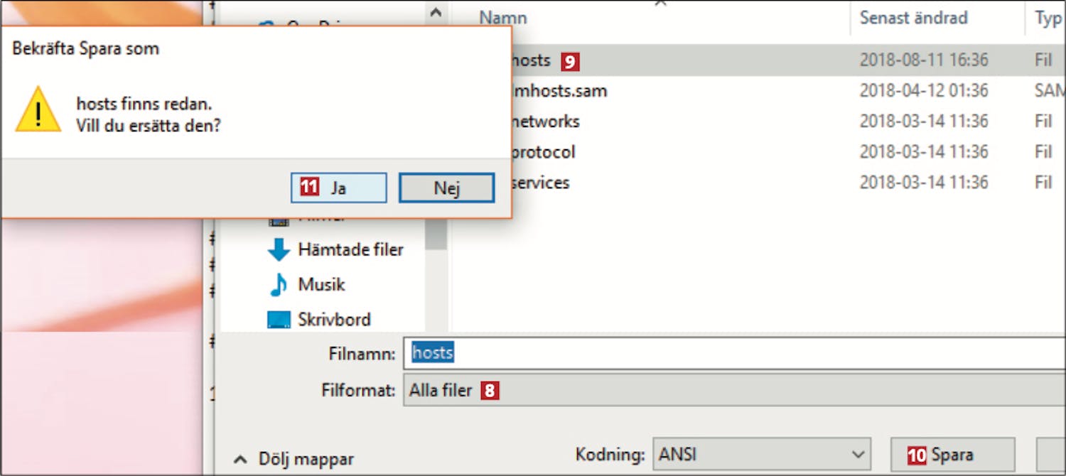 Välj Alla filer 8 vid Filformat. Markera filen hosts 9 och klicka på Spara 10. Svara Ja för att ersätta filen 11. Det kan ta upp till ett dygn innan spärren träder i kraft. Ta bort spärren genom att radera texten du just skrev in och spara filen igen.