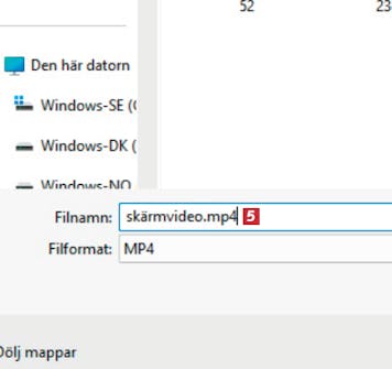 Börja med att använda kortkommandot Windows-tangent + Skift + S. Nu öppnas skärmbildverktyget längst upp på skärmen. Klicka på ikonen som ser ut som en videokamera 1.