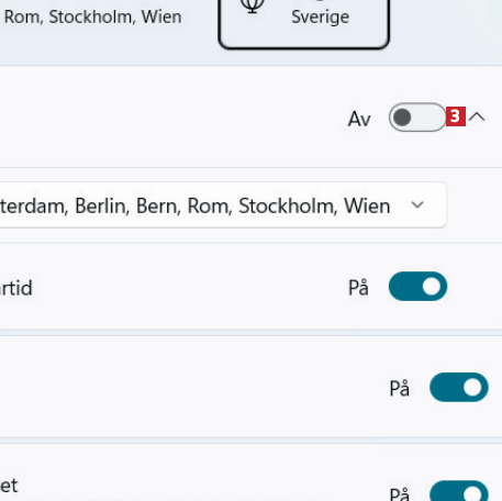 Klicka på reglaget 3 till höger om alternativet Ange tidszon automatiskt så det hamnar i läget Av.
