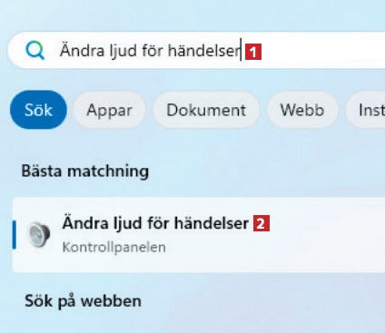 Använd Windows sökfunktion för att söka efter Ändra ljud för händelser 1 och klicka sedan på sökresultatet 2.