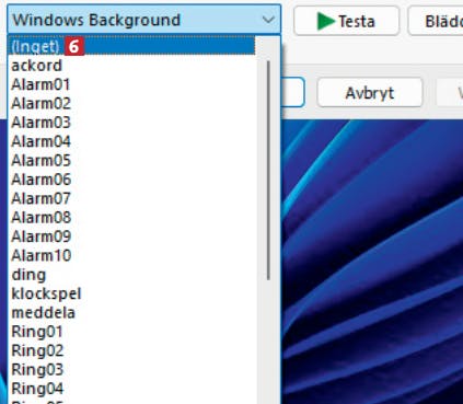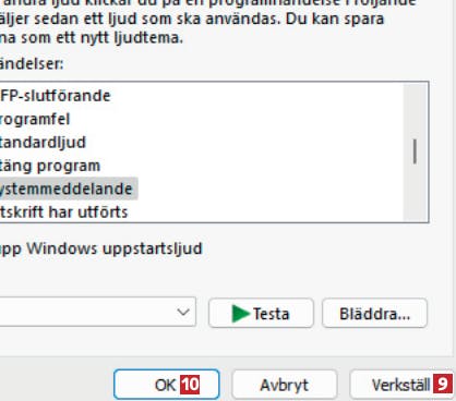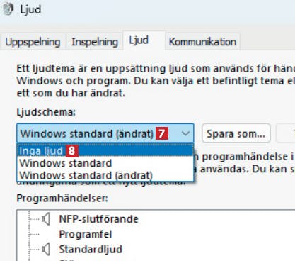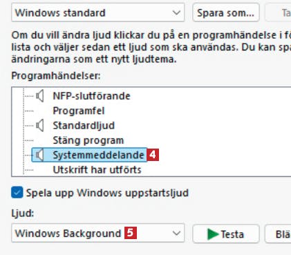 Du kan stänga av systemljuden individuellt genom att välja ett ljud 4 och sedan på rullgardinsmenyn 5.