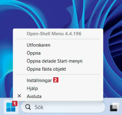 Hämta Open Shell och installera programmet. Högerklicka på Start-knappen 1 i aktivitetsfältet. Du ser nu en annan högerklicksmeny än den vanliga. Välj Inställningar 2.