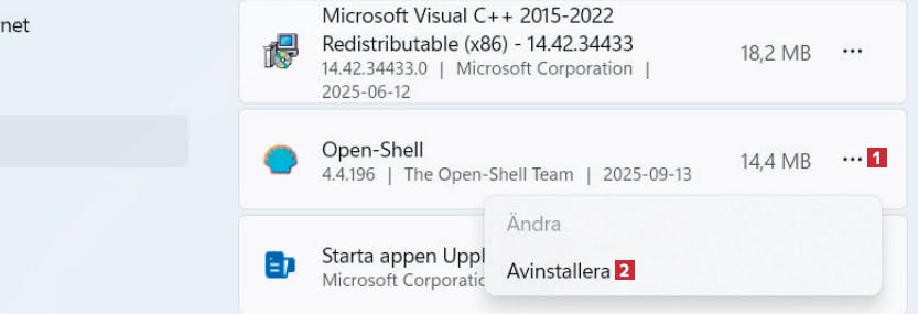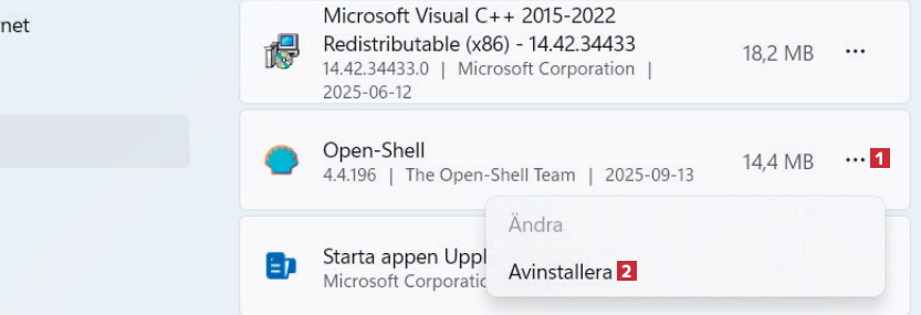 I Windows sökfält skriver du Installerade appar och trycker på Retur. Du nu har öppnat Windows verktyg för att ta bort program från datorn. Bläddra ner till Open-Shell och klicka på de tre punkterna 1 vid namnet. Klicka på Avinstallera 2 följt av Avinstallera igen i fönstret som öppnas. Följ sedan bara guiden som öppnas så avinstalleras programmet.