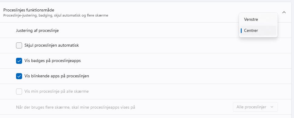 - Vid Justering av aktivitetsfältet ska du välja Vänster.