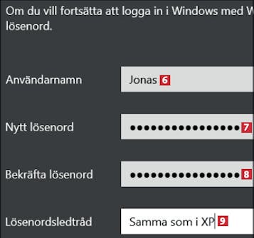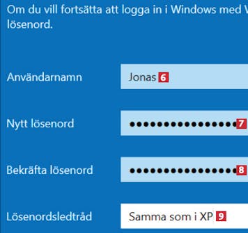 Skriv ett användarnamn 6 och ett nytt lösenord 7. Upprepa lösenordet 8 och skriv en ledtråd som hjälper dig att minnas lösenordet 9 till det lokala kontot.