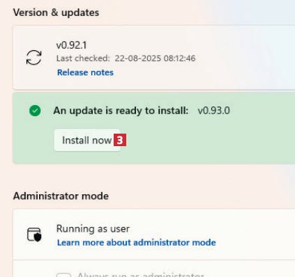 Klicka på Install now 3 för att uppdatera PowerToys till den senaste versionen så att du får tillgång till Command Palette.