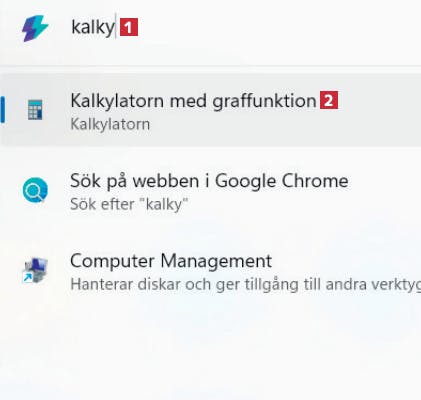 Börja skriva det du letar efter, till exempel kalky 1 för att öppna Kalkylatorn 2. Öppna programmet med Retur-tangenten, eller tryck på Esc-tangenten för att rensa sökfältet.