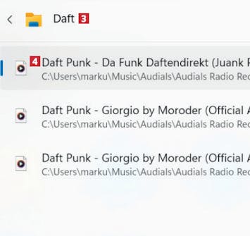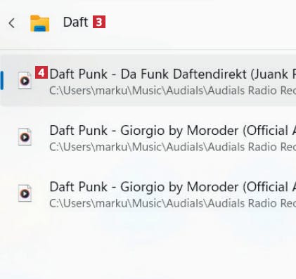 För att söka efter en fil på datorn börjar du skriva filens namn, till exempel daft 3, som här hittar låtar med bandet Daft Punk 4.