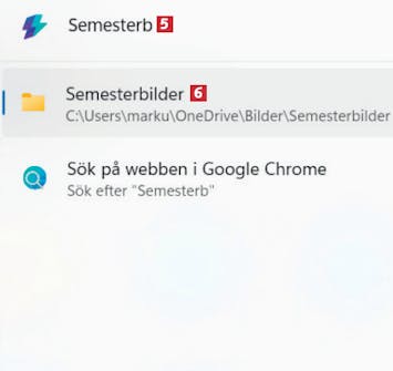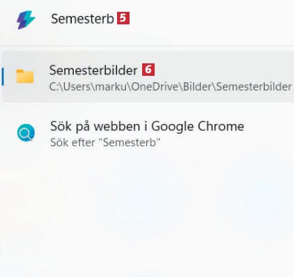 Du kan också söka efter mappar med Command Palette, som att skriva Semesterb 5 för att hitta mappen Semesterbilder 6.