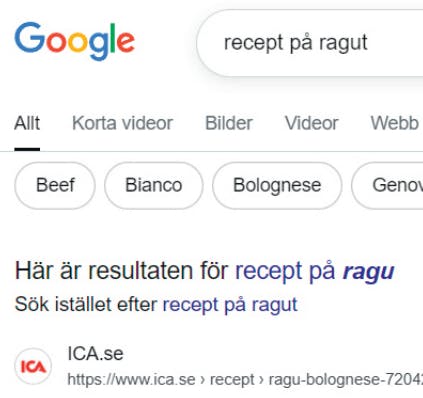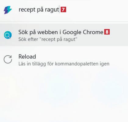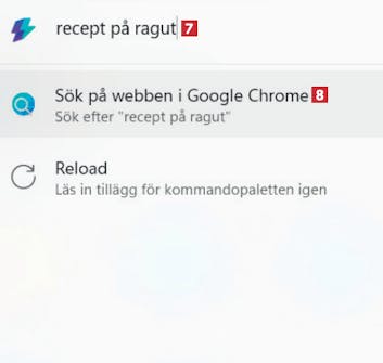 Om du vill söka efter något på webben måste du skriva ?? i sökfältet. Då får du se en sökikon 7. Skriv det du söker efter, till exempel recept på ragut 8 och tryck Retur.