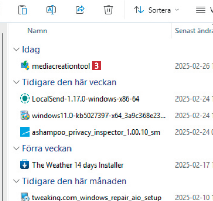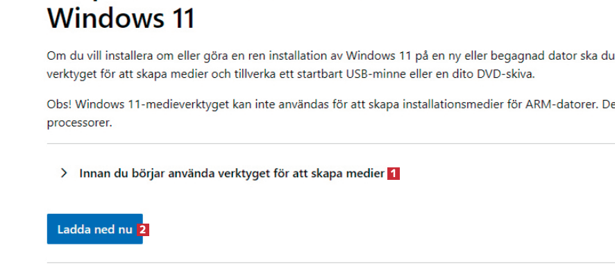Besök microsoft.com/sv-se/software-download/windows11 med din webbläsare. Under Innan du börjar använda verktyget för att skapa medier 1 väljer du Ladda ned nu 2. En fil laddas ner till din dator.