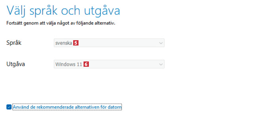 Välj svenska 5 och Windows 11 6. På så sätt ser du till att du får den senaste versionen av Windows på svenska. Klicka på Nästa.