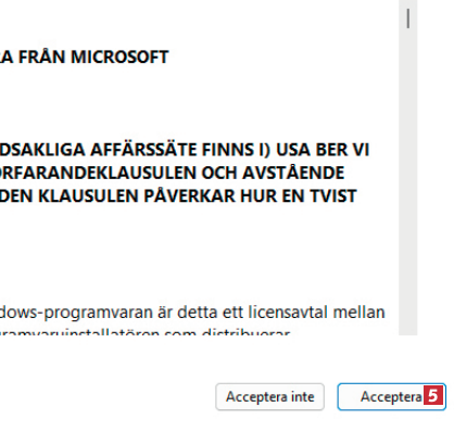 När du kommer hit klickar du på Acceptera 5 . Systemet kontrollerar om datorn är redo för Windows 11-uppdateringen, vilket kan ta några minuter.
