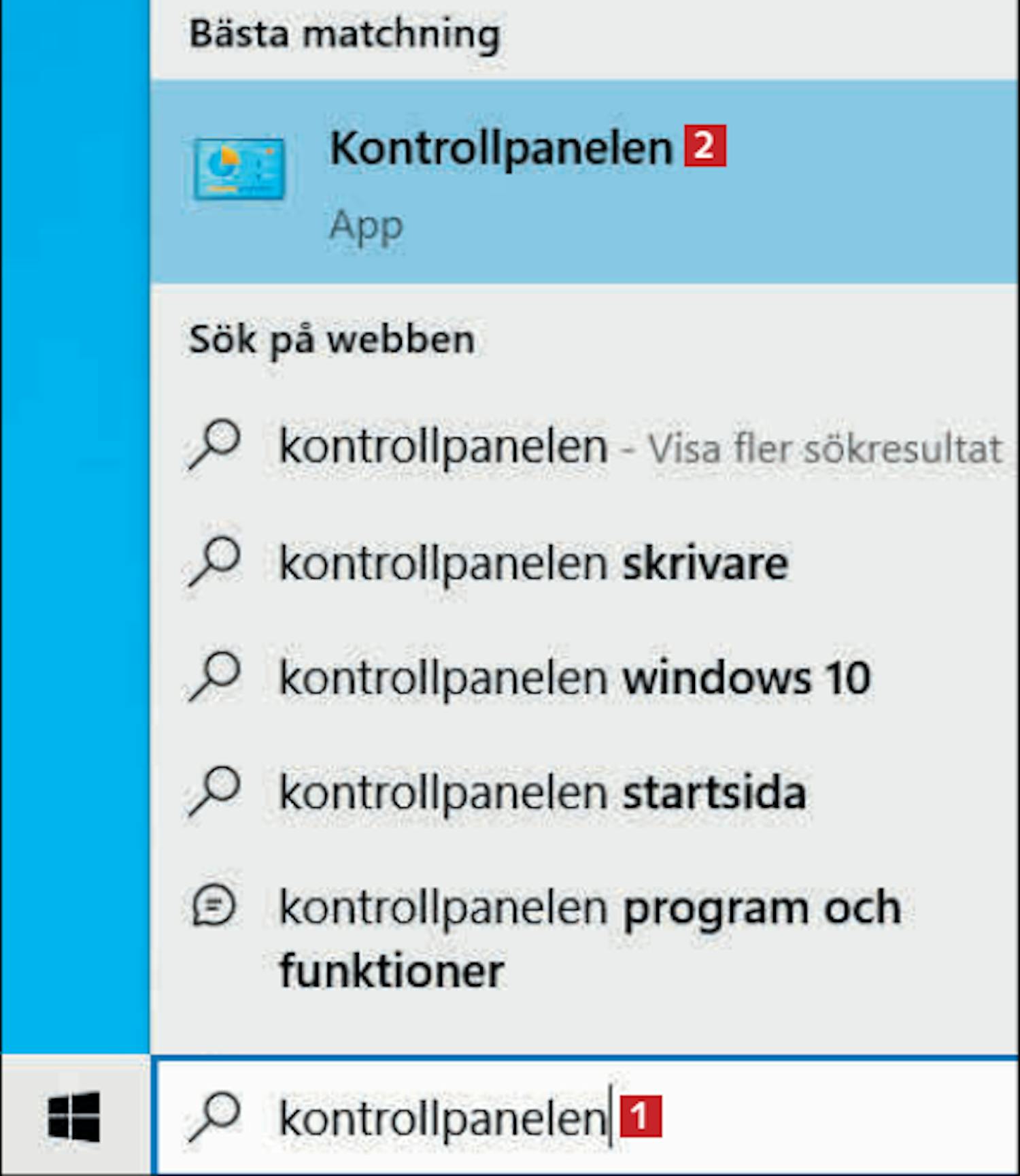 Skriv först kontrollpanelen 1 i sökfältet och klicka på sökresultatet Kontrollpanelen 2 .