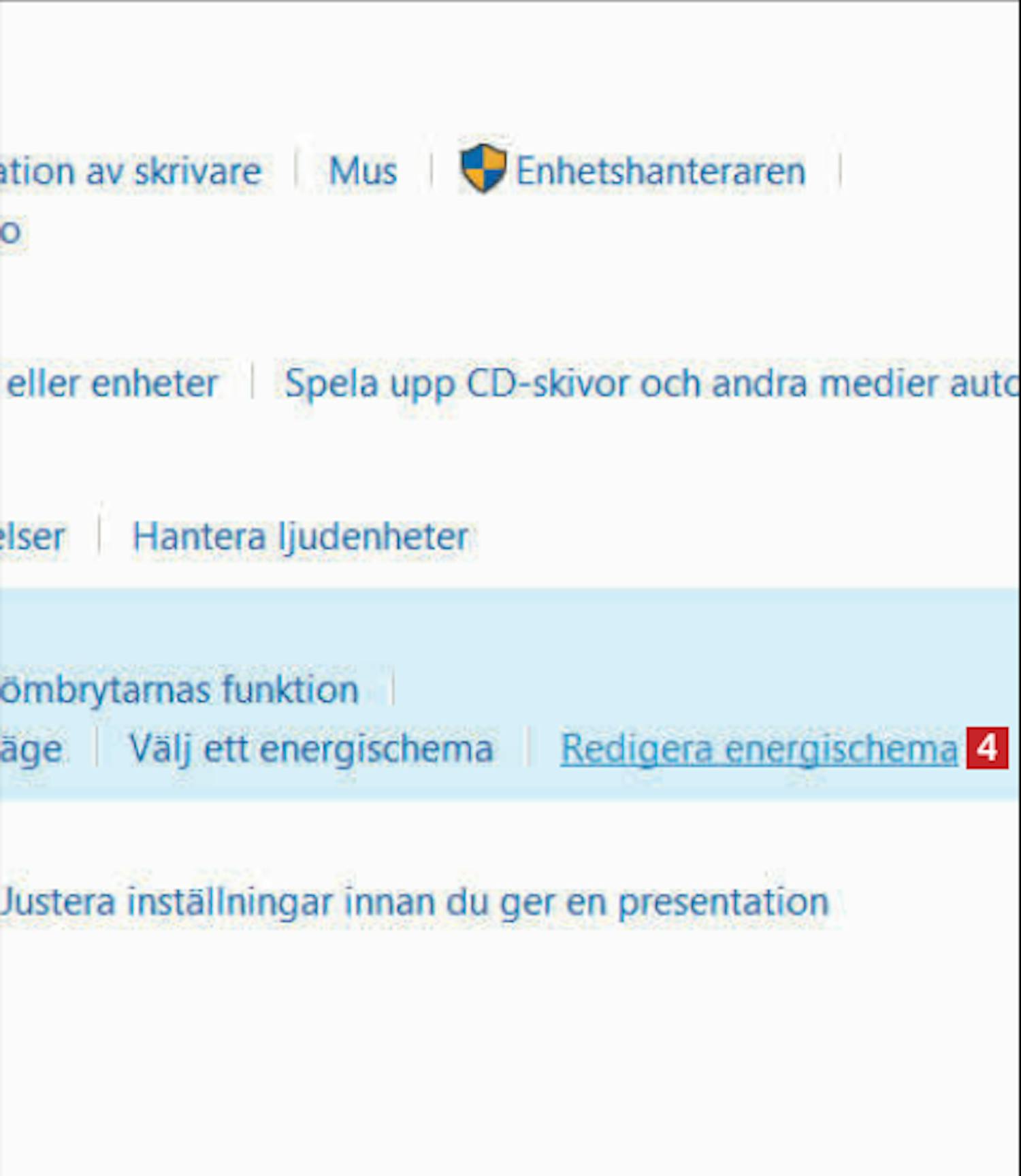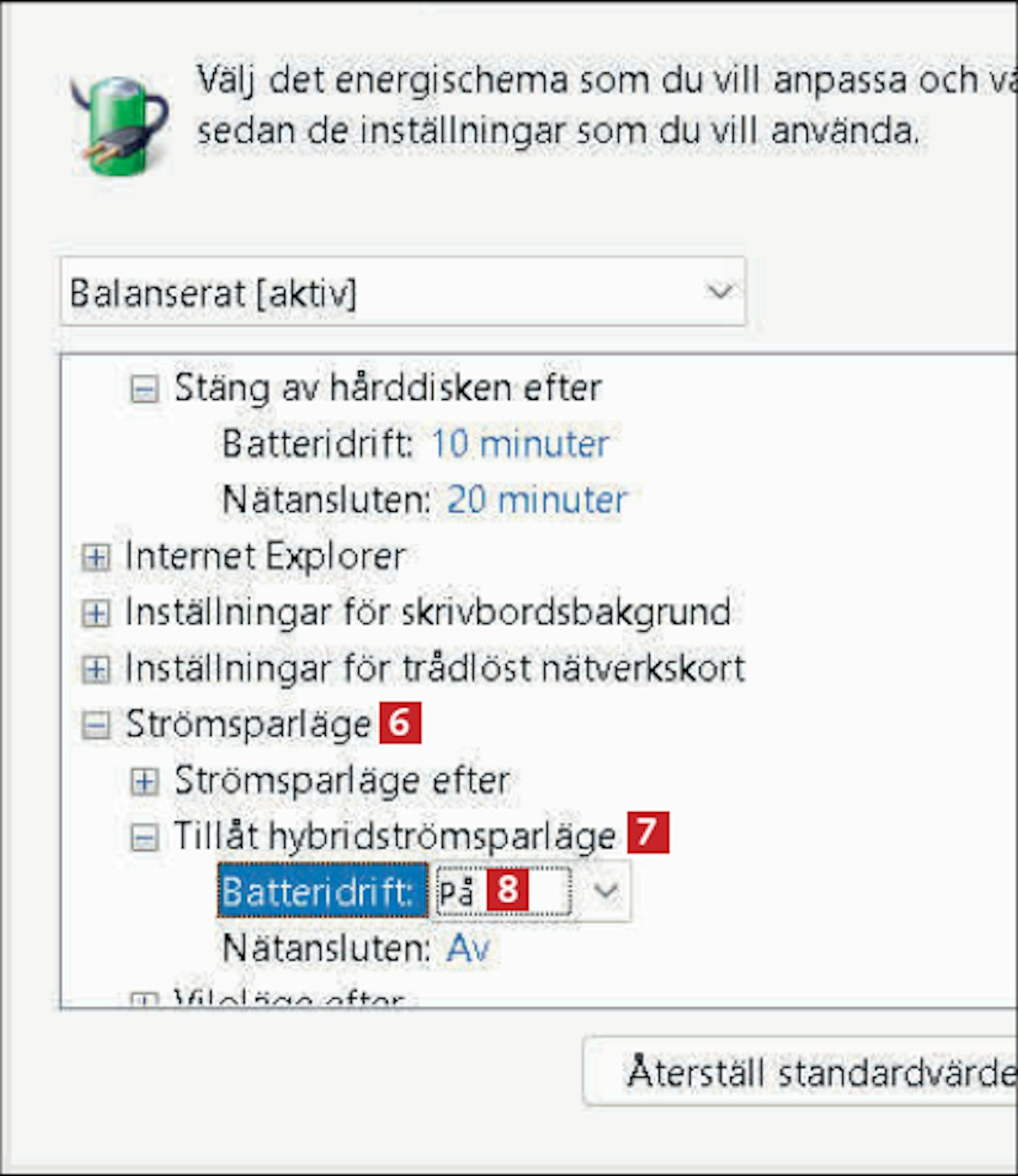 Klicka på Strömsparläge 6 följt av Tillåt hybridströmsparläge 7 . Klicka på På 8 .