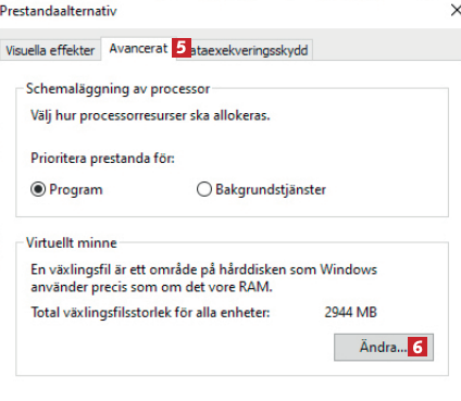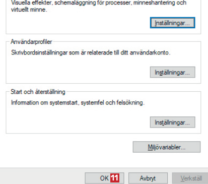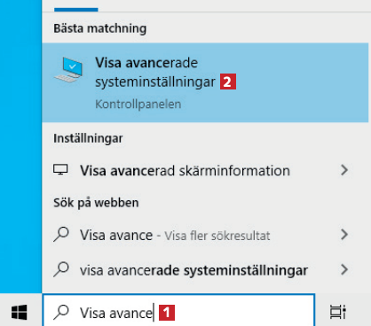 Skriv först visa avancerade systeminställningar 1 i sökfältet och klicka på Visa avancerade systeminställningar 2.