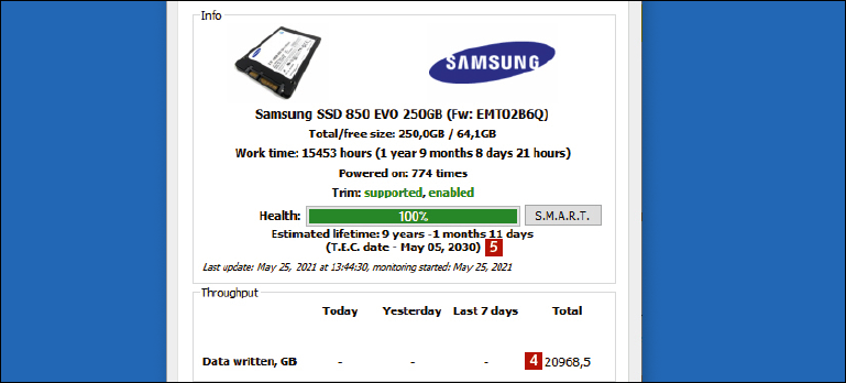 På en SSD kan de enskilda minnescellerna bara skrivas över ett visst antal gånger. Därför kan man ganska exakt beräkna hur länge till enheten håller. Det kan du se med SSD Life, som kan beräkna när disken kommer att haverera. Med AS SSD Benchmark kan du även testa läs- och skrivhastigheter samt se om enheten fortfarande är i fin form.