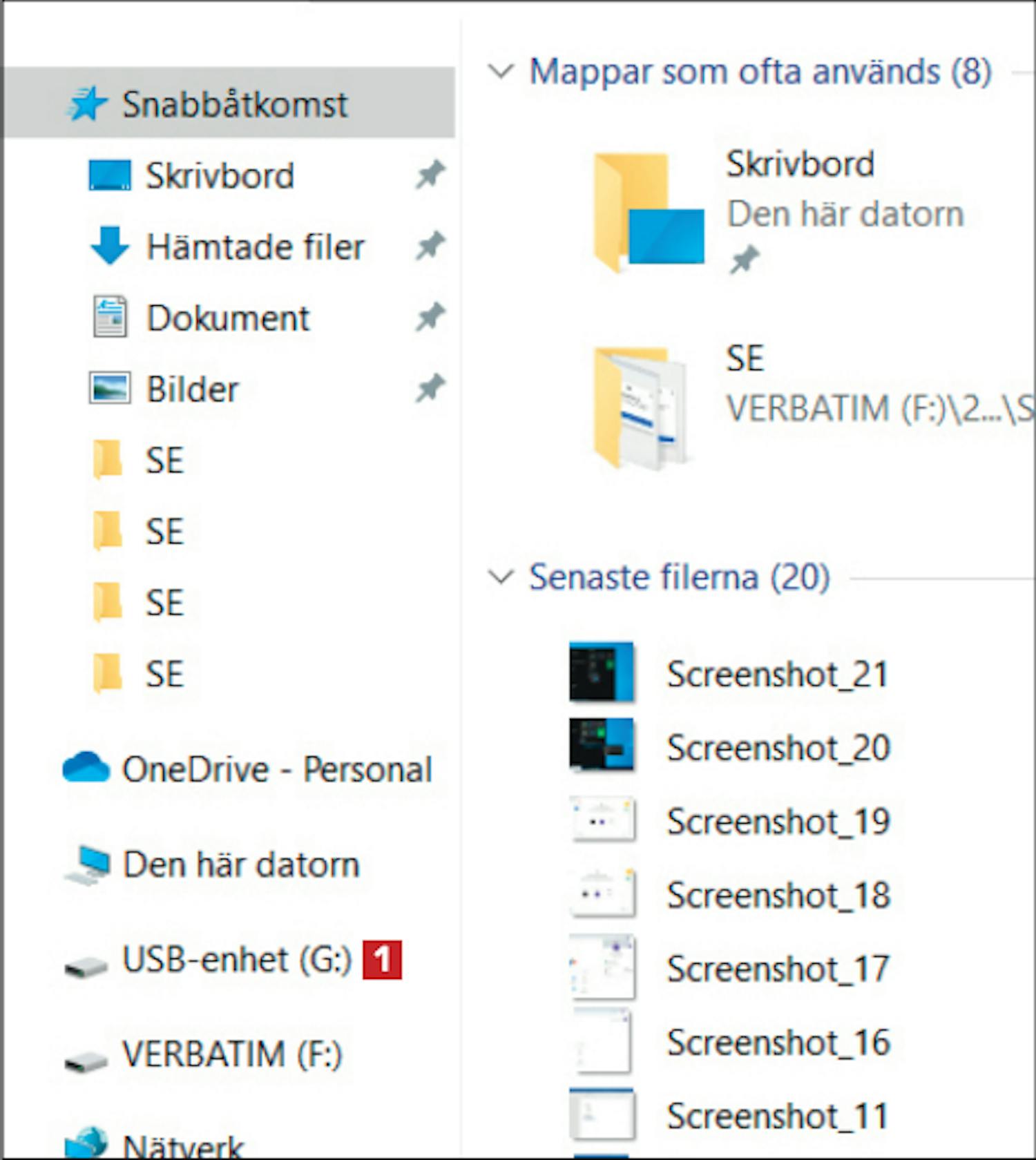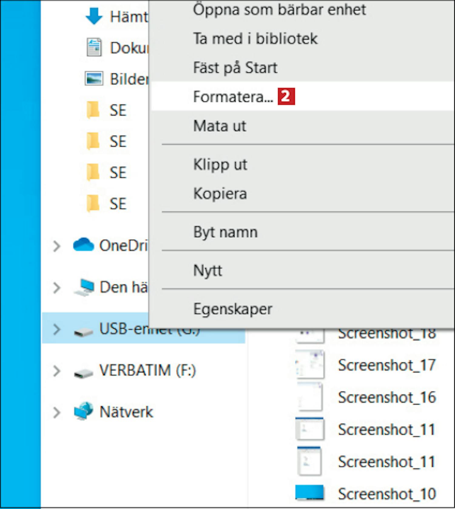 Sätt i USB-minnet i datorn och öppna Utforskaren. Högerklicka på USB-minnet i Utforskaren 1 .