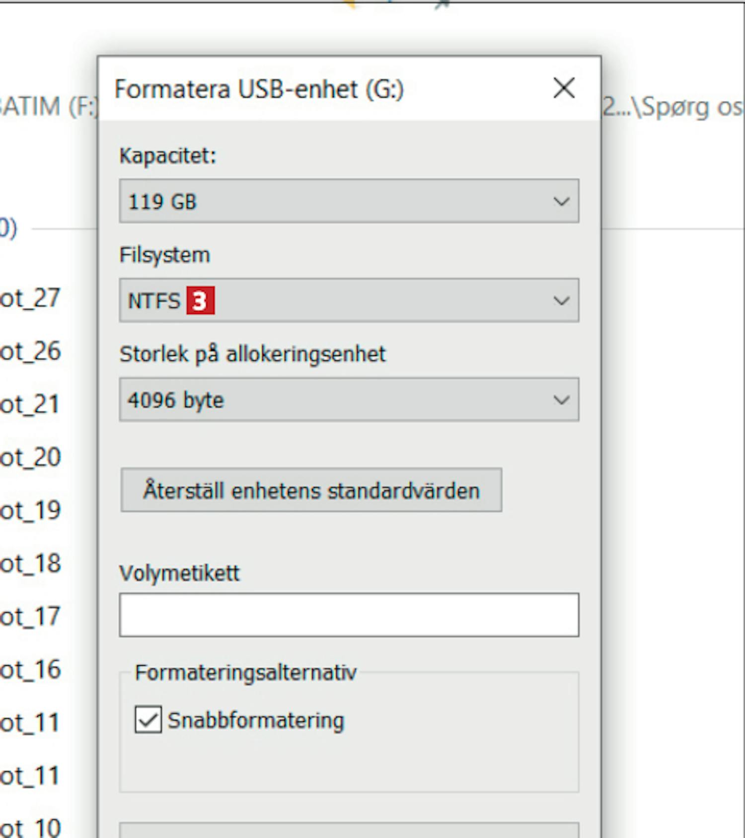 Det gör du genom att formatera USB-minnet. Det görs i Windows och tar några minuter.Här visar vi hur du gör och hur du ställer in USB-minnet så att det använder det bästa filsystemet, NTFS.