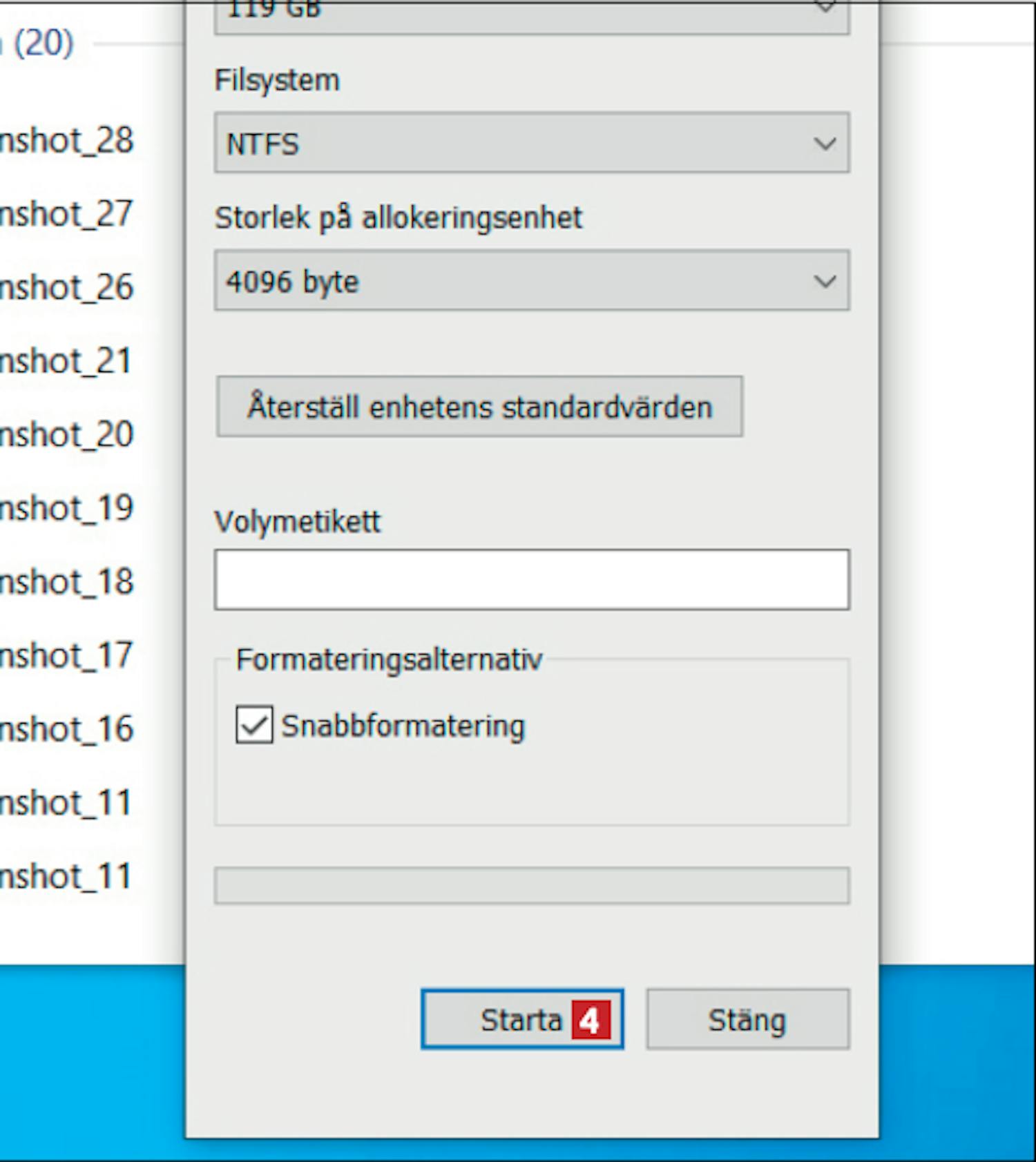 Klicka på Starta 4 följt av OK för att genomföra formateringen.